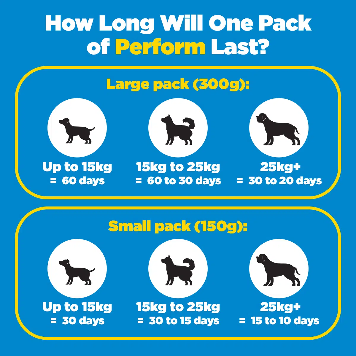 Perform is suitable for all breeds and life stages over 24 weeks. Whether your dog is active, working, in training, or simply needs a clean nutritional boost, this supplement offers a smart way to raise the bar, without excess calories.