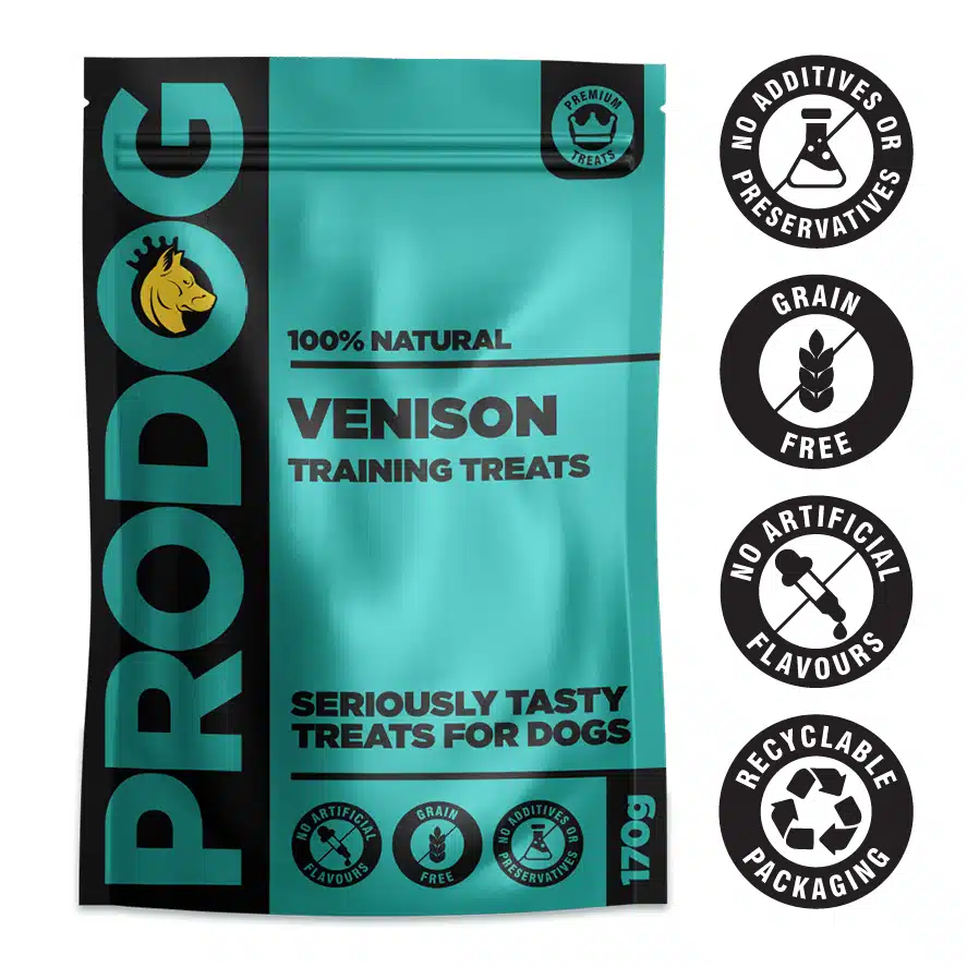 High-value dog training treats made with British venison, chicken, and sweet potato. Soft, bite-sized, and irresistibly tasty. Designed to keep any dog focused and motivated, even the fussiest eaters. Perfectly sized for puppies and small dogs, yet rewarding enough for everyday training with dogs of all sizes and ages.
