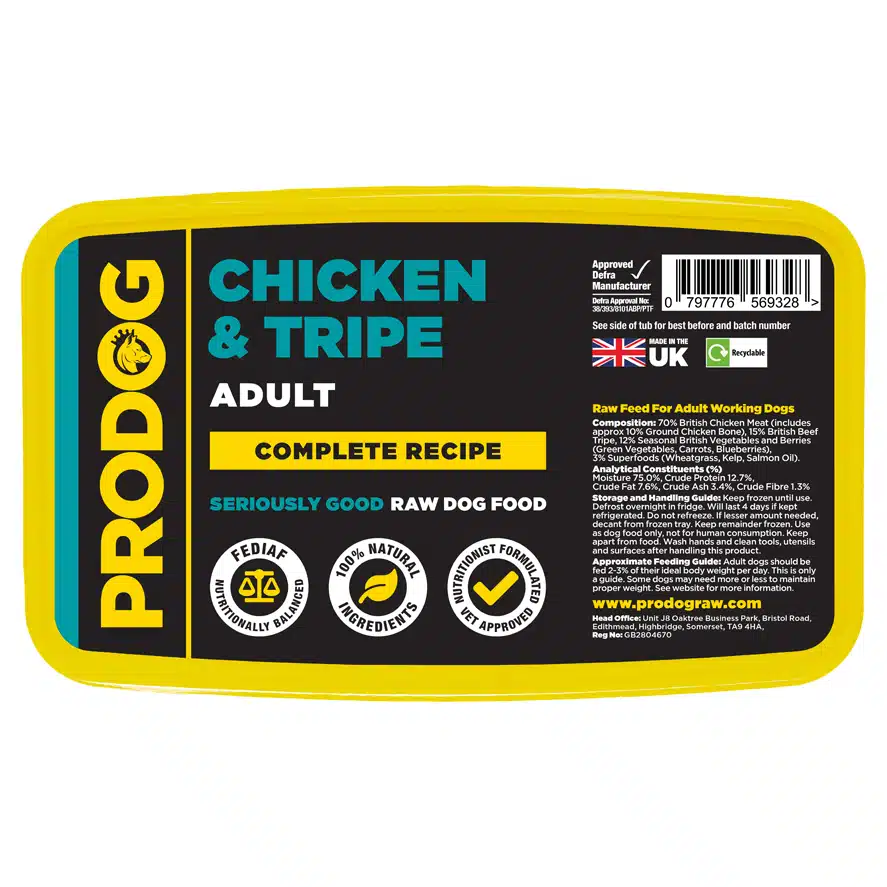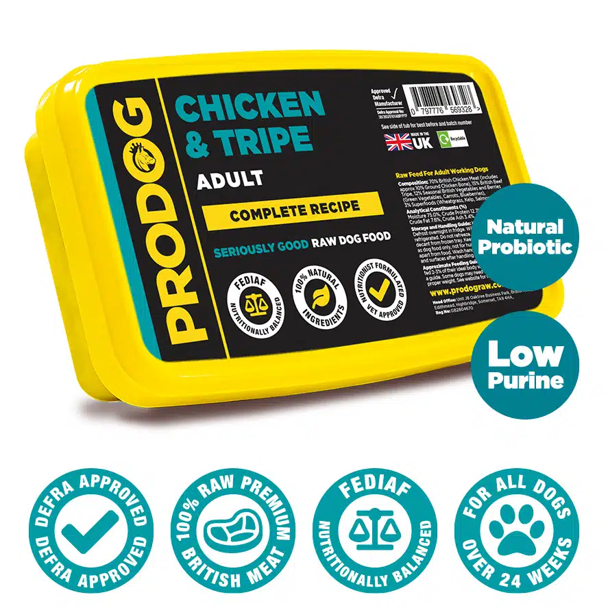 ProDog Chicken & Green Tripe Complete raw dog food is a raw meat product and should be handled observing standard hygiene rules.