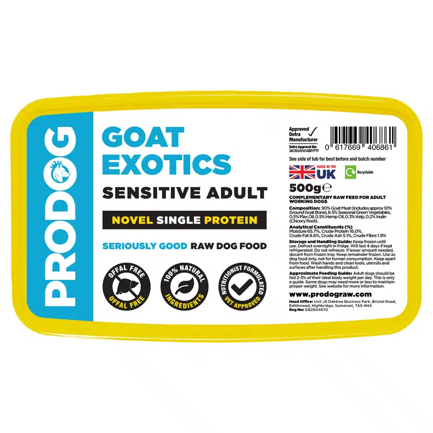 Our Goat Exotics meal is a novel protein raw dog food recipe made with premium, pasture reared goat meat and ground goat bone, responsibly sourced for trusted quality. Blended with a sprinkle of seasonal leafy greens, kelp, inulin, and enhanced with flaxseed and hemp oil. Vet-approved and canine nutritionist formulated, it’s designed for working dogs with intolerances or sensitivities to commonly farmed meats. Single protein, naturally tasty and packed with powerful natural nutrition.