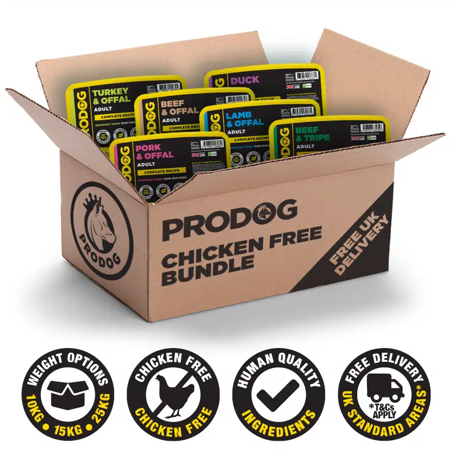 Built for dogs who need a chicken-free diet without sacrificing quality, balance, or taste. This bundle includes a curated selection of our FEDIAF-compliant Complete raw dog food meals, with a higher proportion of our nutrient dense ‘with offal’ recipes. Every meal is formulated by canine nutritionists using only 100% fresh, natural ingredients — no fillers, no shortcuts.