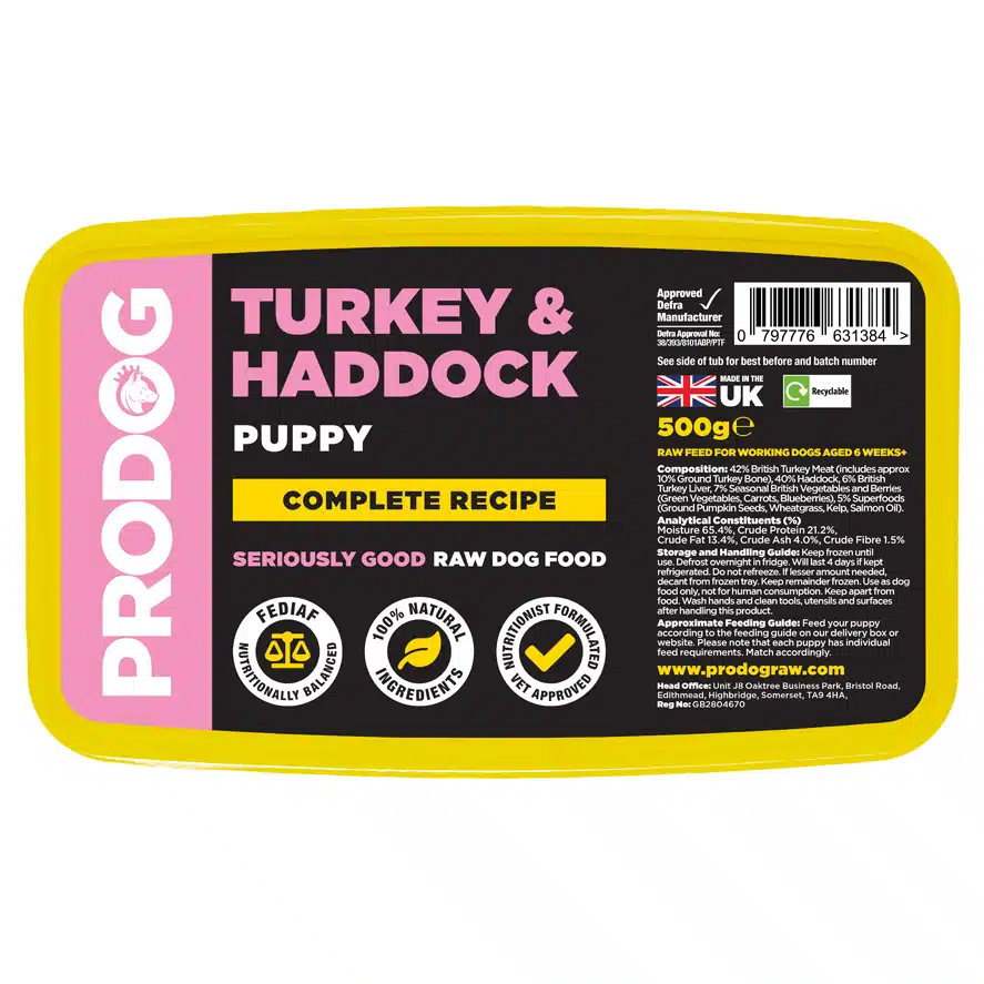 ProDog Turkey & Haddock raw puppy food is a raw meat product and should be handled observing standard hygiene rules.