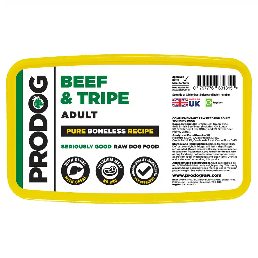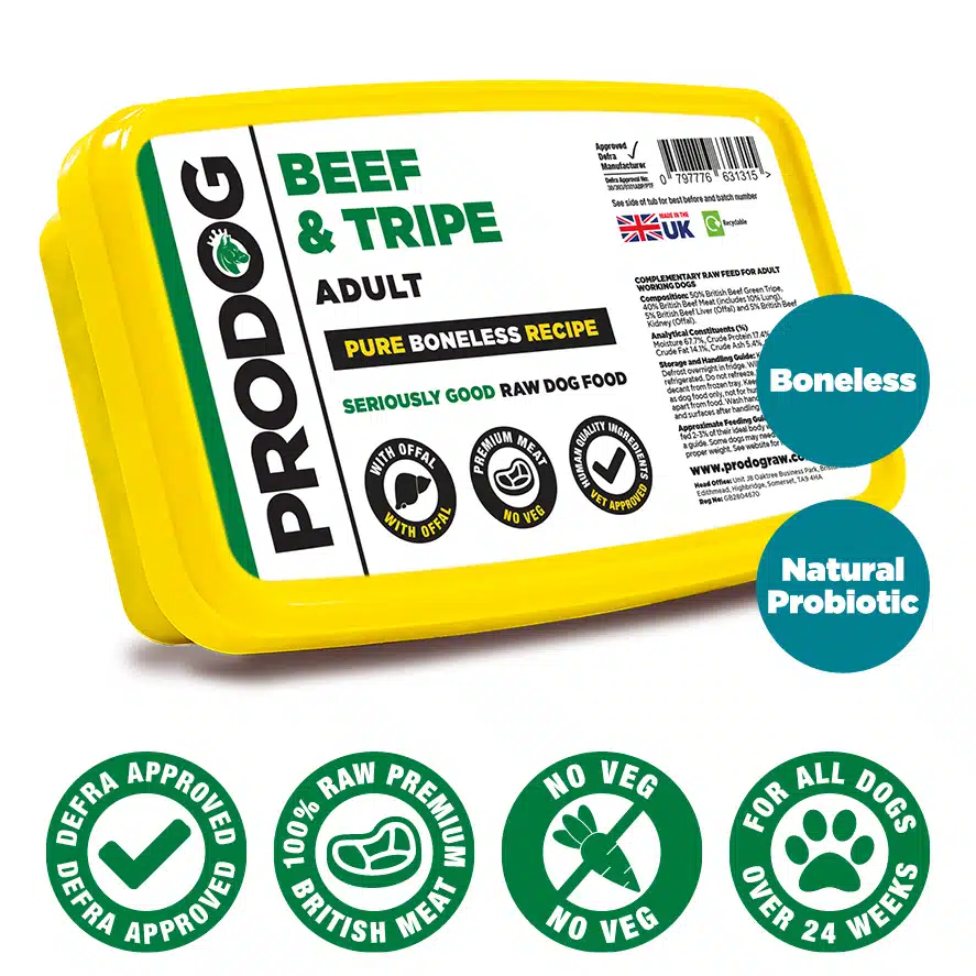 ProDog Pure Beef & Green Tripe raw dog food is a raw meat product and should be handled observing standard hygiene rules.