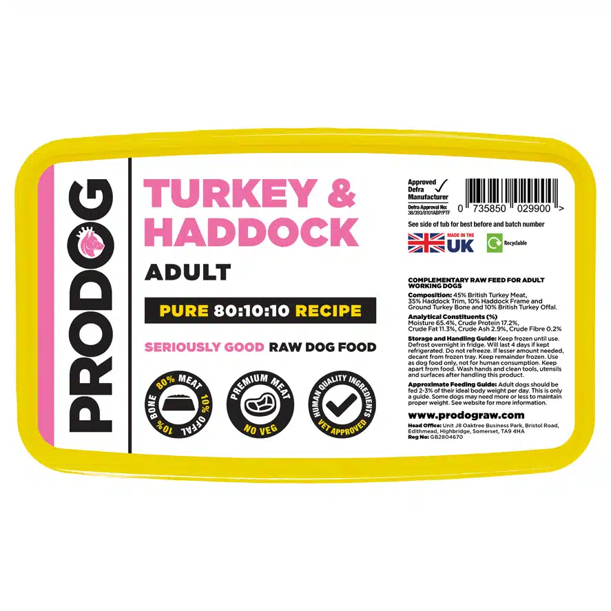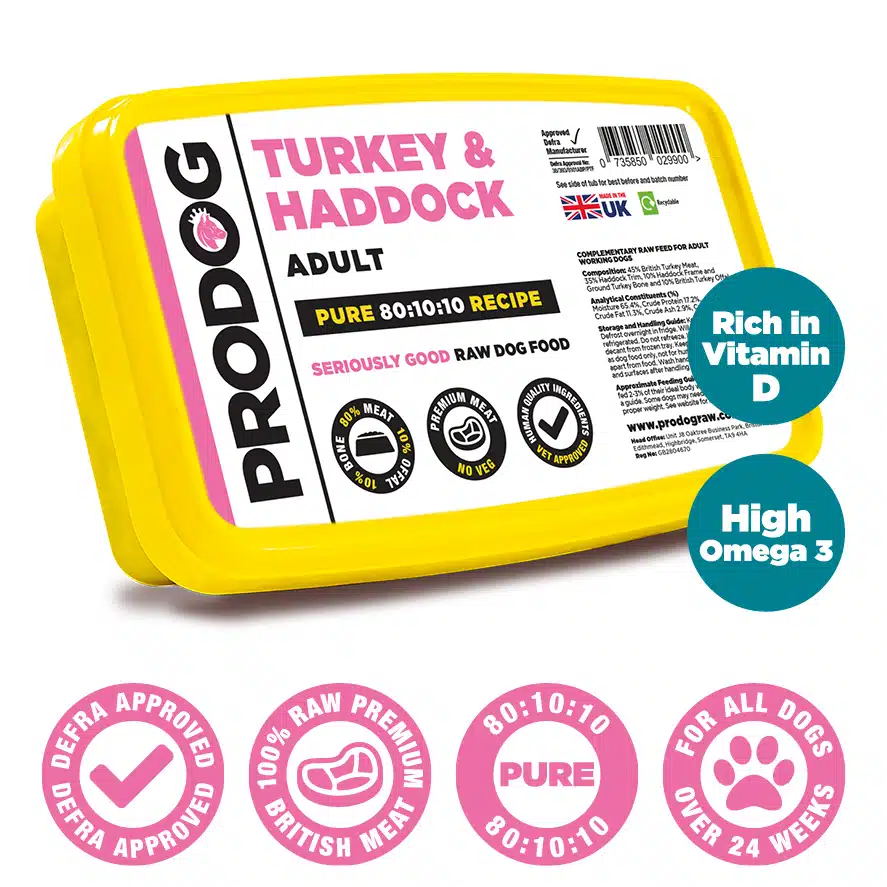 ProDog Pure Turkey & Haddock raw dog food is a raw meat product and should be handled observing standard hygiene rules.