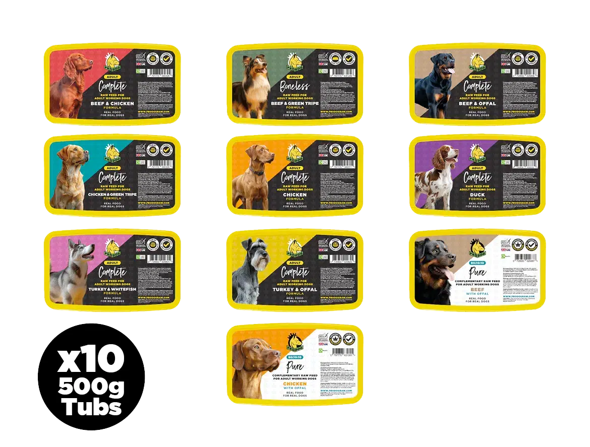 An assortment of our delicious and nutritious raw dog food meals, in a convenient 5kg pack (Economy Core pack is 4.5kg). Choose from Adult, Puppy, 80:10:10, Economy Core or Sensitivity Support. The varied range of meals in our sample packs allows you and your canine companion to easily experience a variety of our raw food options.Â
